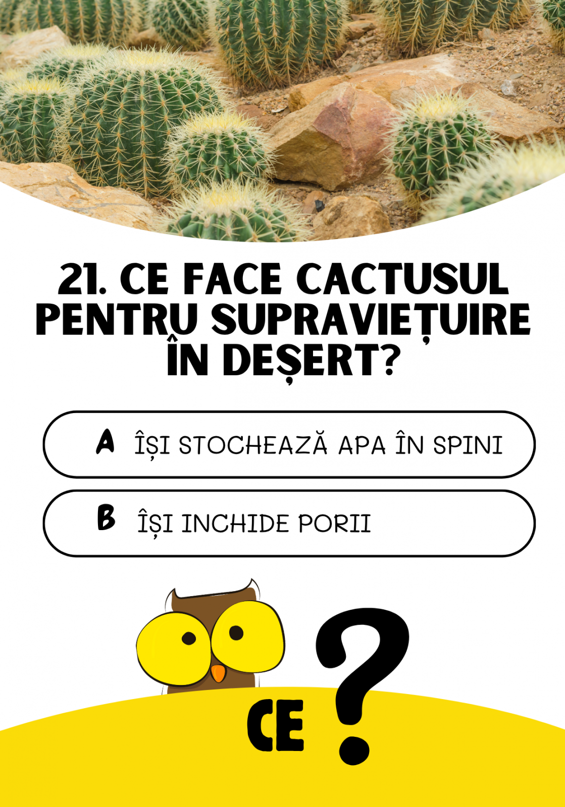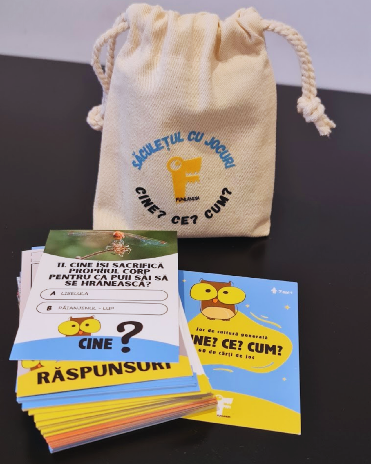 Jocul care îți testează cunoștințele și te provoacă să descoperi lumea într-un mod distractiv! Potrivit pentru varstele 7-99 ani :), acest joc de cultură generală este o călătorie interactivă prin istorie, științe, tehnologie și multe altele. Fiecare cartonaș conține o întrebare captivantă din cele trei categorii principale – Cine? Ce? Cum? – și oferă două variante de răspuns pentru a face jocul accesibil și antrenant.