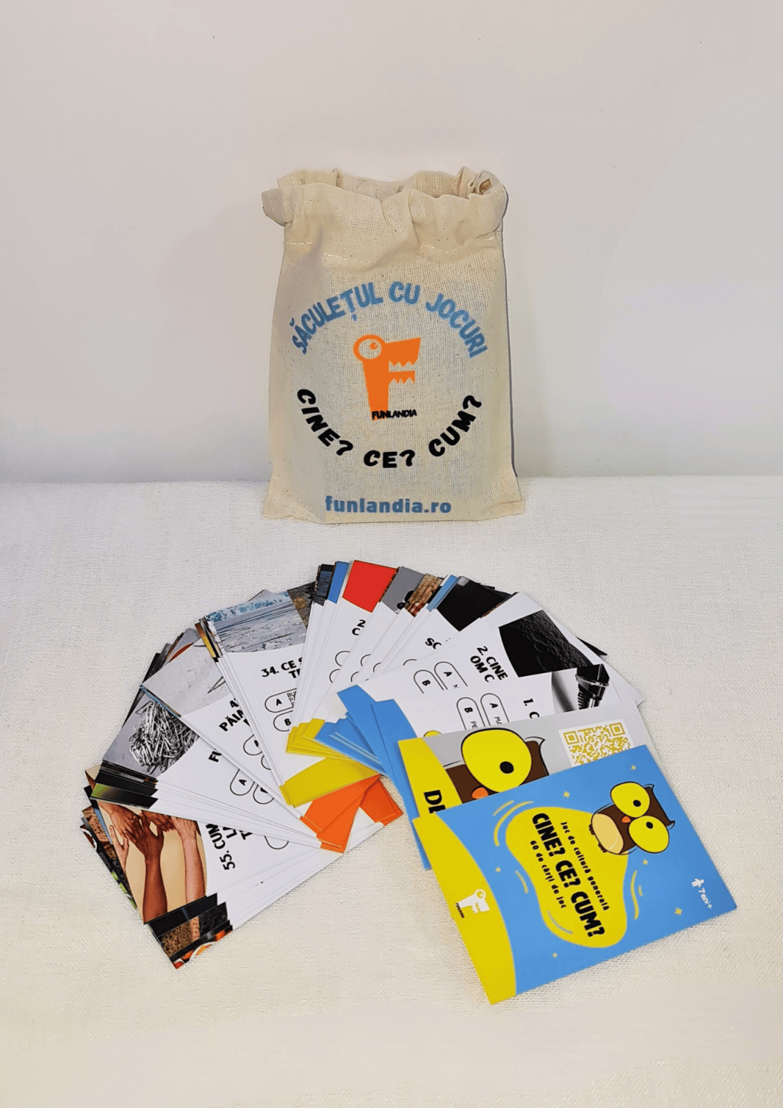 Saculetul Cu Jocuri: 60 de cartonașe rezistente, fine și plăcute la atingere într‐un săculeț de bumbac adorat de cei mici. Textul este scris cu litere de tipar, pentru ca micii jucători să poată citi chiar ei dacă sunt la început în învățarea alfabetului.