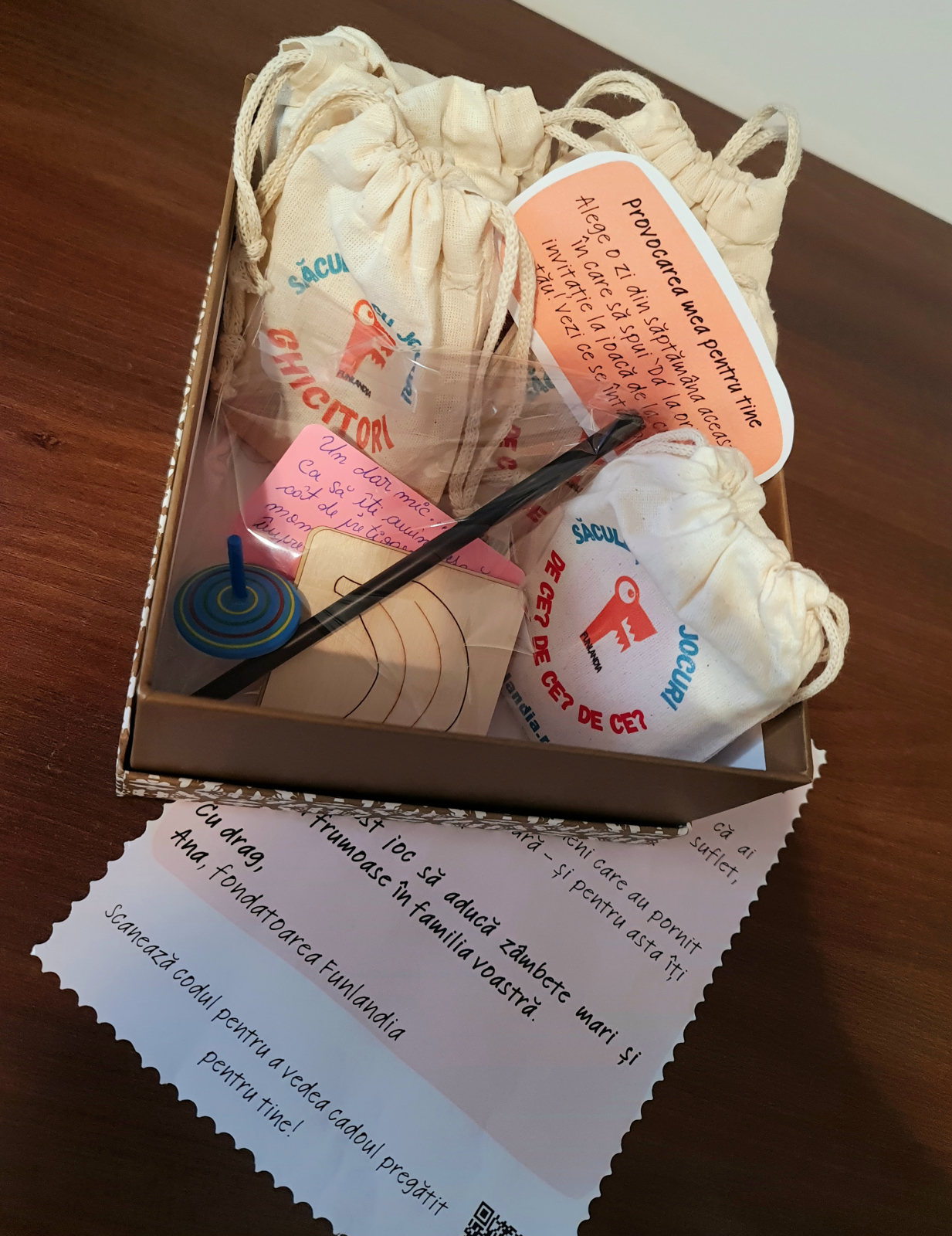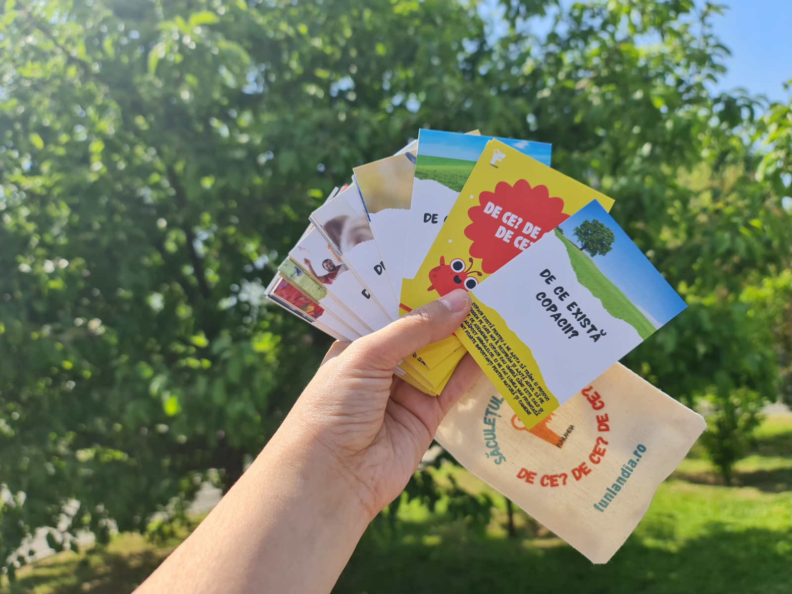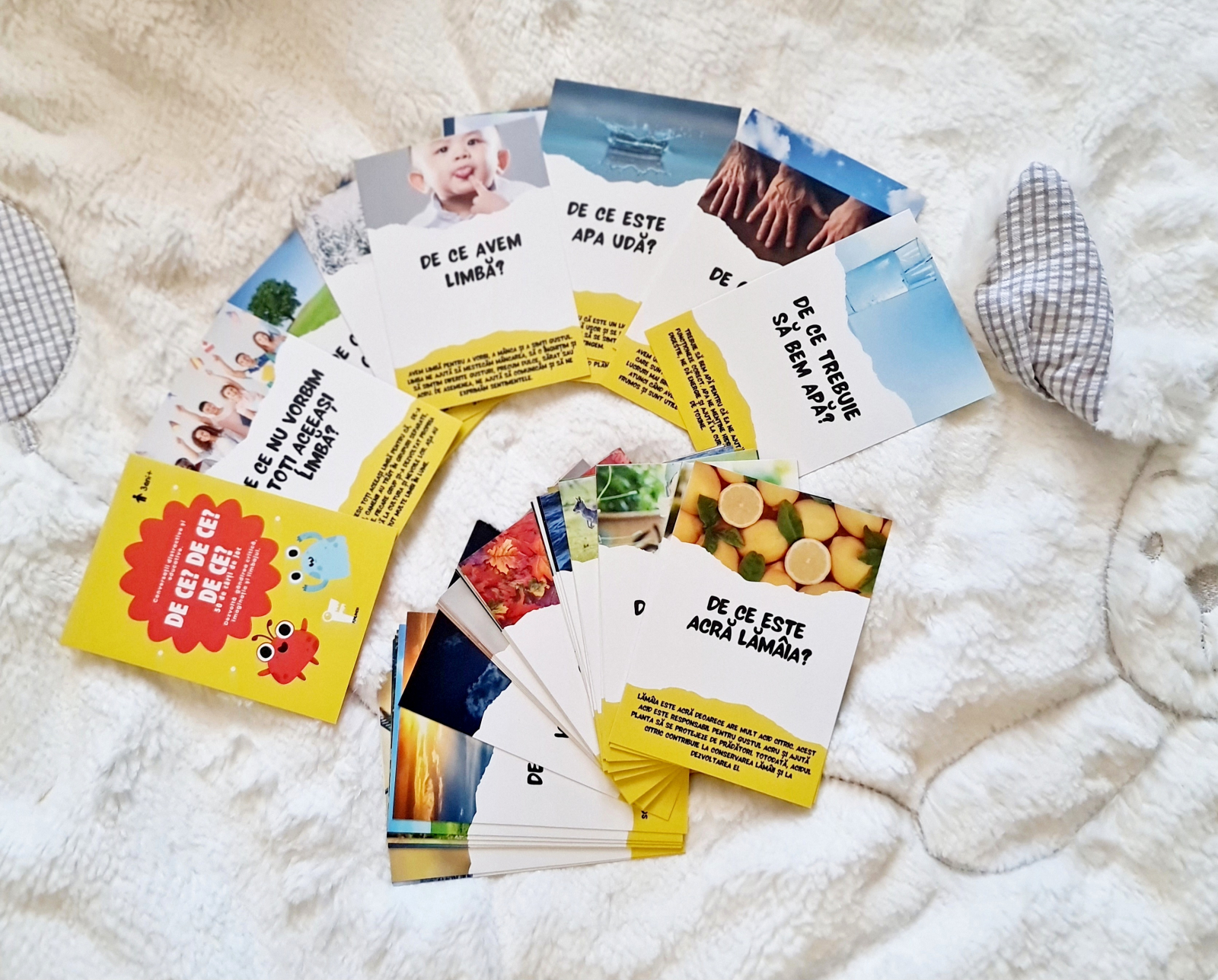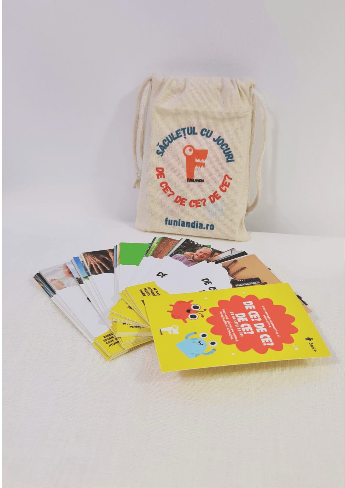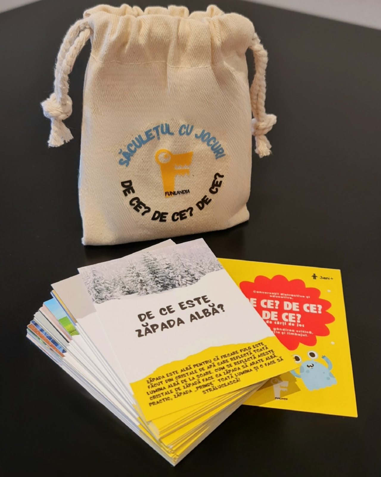 Saculetul Cu Jocuri: 50 de cartonașe cu întrebări de tipul „De ce?”, fine și plăcute la atingere într‐un săculeț de bumbac rezistent și adorat de cei mici. Cartonașele răspund celor mai frecvente curiozități ale copiilor pre-școlari. Răspunsurile sunt ușor de înțeles și sunt însoțite de imagini frumoase, reale. Textul este scris cu litere de tipar, pentru ca micii jucători să poată citi chiar ei dacă sunt la început în învățarea alfabetului.