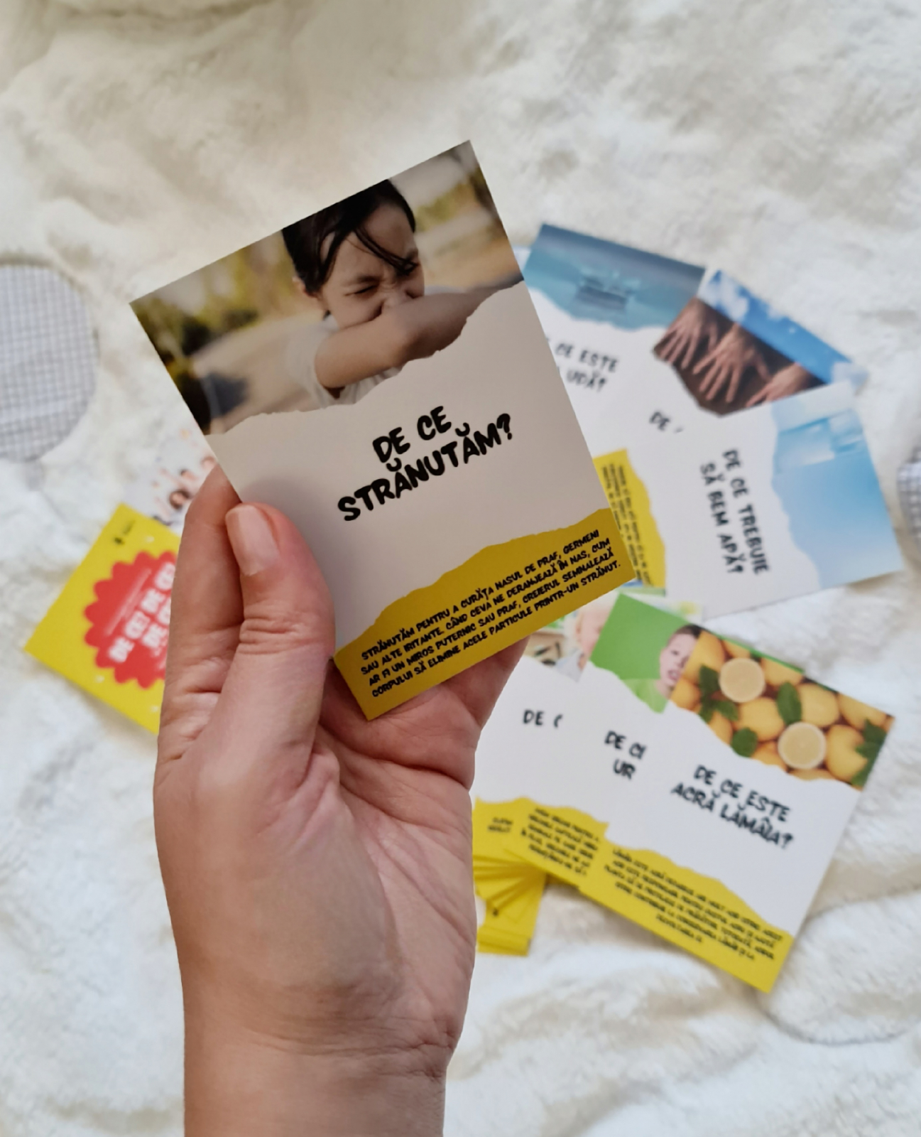 1. Mama/Tata & copilul: Roagă copilul să extragă o carte de joc. Citește copilului întrebarea de pe cartonaș, iar după ce oferă răspunsul, citiți împreună răspunsul, care este foarte ușor de înțeles și de reținut. Repetați cu câte cărți doriți sau până le parcurgeți pe toate.