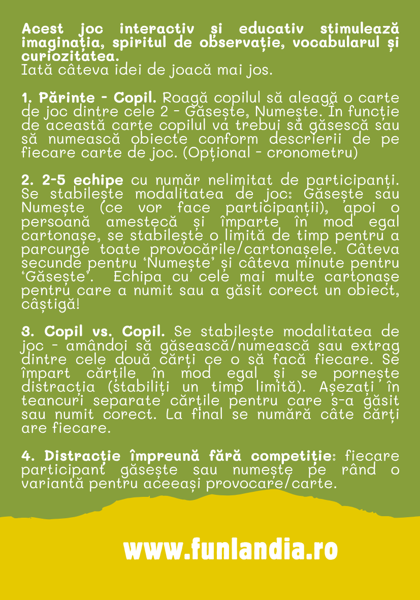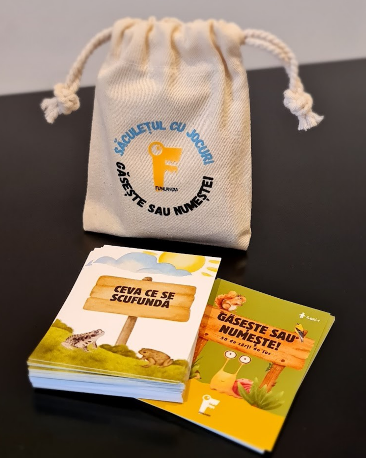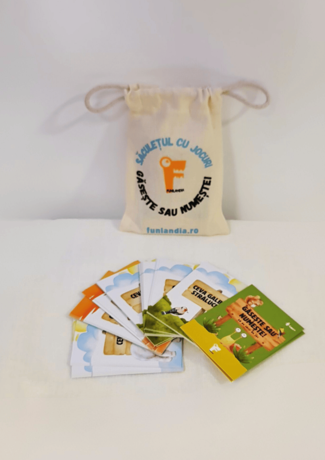 Saculetul Cu Jocuri: 50 de cartonașe de joc rezistente, fine și plăcute la atingere într‐un săculeț de bumbac adorat de cei mici. Provocările sunt scurte, ușor de înțeles și sunt însoțite de imagini frumoase, în culori pastelate. Textul este scris cu litere de tipar, pentru ca micii jucători să poată citi chiar ei dacă sunt la început în învățarea alfabetului.